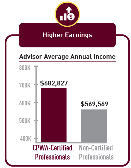 A 2025 study by CEG Insights found that Certified Professional Wealth Advisor® (CPWA®) professionals earn approximately 20% more annually than advisors without Institute certifications. That’s largely because, on average, 44.1% of clients served by professionals holding the CPWA® designation are either high-net-worth (HNW) or $25 million+ clients. This compares to just 33.4% of such clients served by professionals who hold only the CFP® certification.